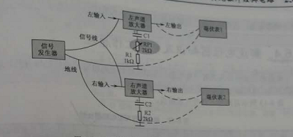 立体声平衡调整方法:给左右声道输入适当的相同大小的测试信号(一般特定频率的正弦信号,有信号发生器提供),如图2所示,在左、右声道输出端分别街上毫伏表,调整平衡贴片可调电阻RP1,使两个声道输出信号幅度大小相等。