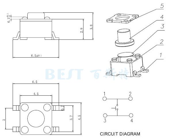 轻触开关TS-1185E的尺寸3×4,基座高度为1.5,总体高度有1.8/2.0/2.5三种,有带定位柱和不带定位柱两种选择,一般常用带定位柱。此款型号可称为两脚贴片轻触开关或3×4贴片小乌龟开关。TS-1185E轻触开关多适用于医疗,数码,通讯器材,对讲产品等。